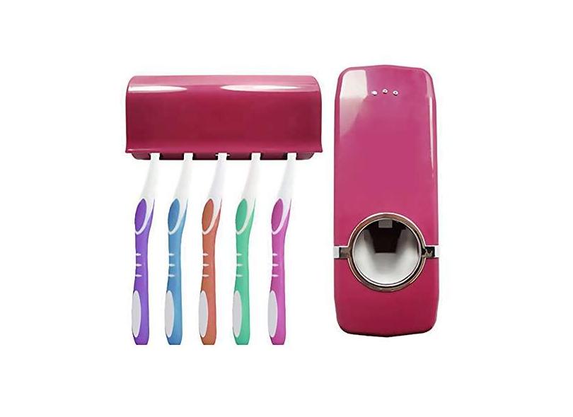 Mabor Dispensador automático de pasta de dente montado na parede, kit espremedor de pasta de dente com 5 suportes de escova de dentes de parede organizador com capa à prova de poeira para chuveiro e banheiro