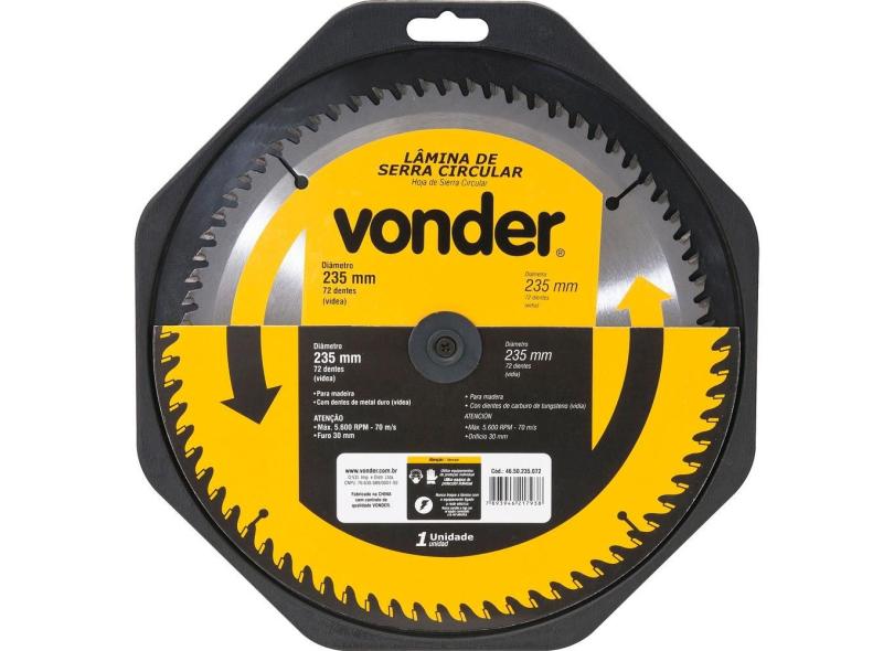 O menor preço encontrado no Brasil para Lamina serra circular vídea 235x30x3,0mm 60 dentes 5600 rpm para madeira - Vonder atualmente é R$ 104,90.