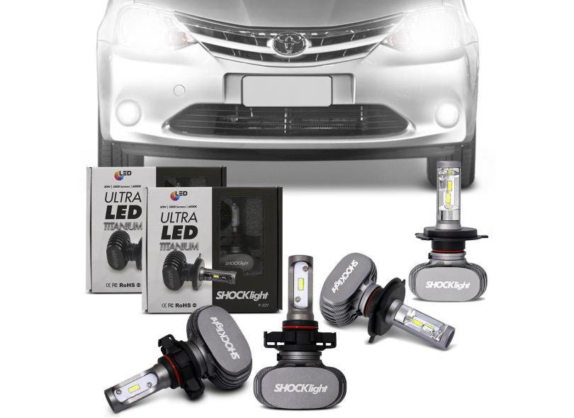 Kit Lâmpadas Ultra LED Toyota Etios 2013 A 2014 Farol Alto Baixo H4 Milha H16 6000K Efeito Xênon