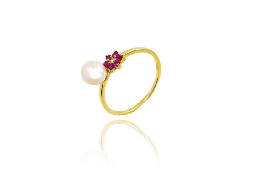 Anel Ouro Amarelo 18K Pérola Com Flor De Rubi 20