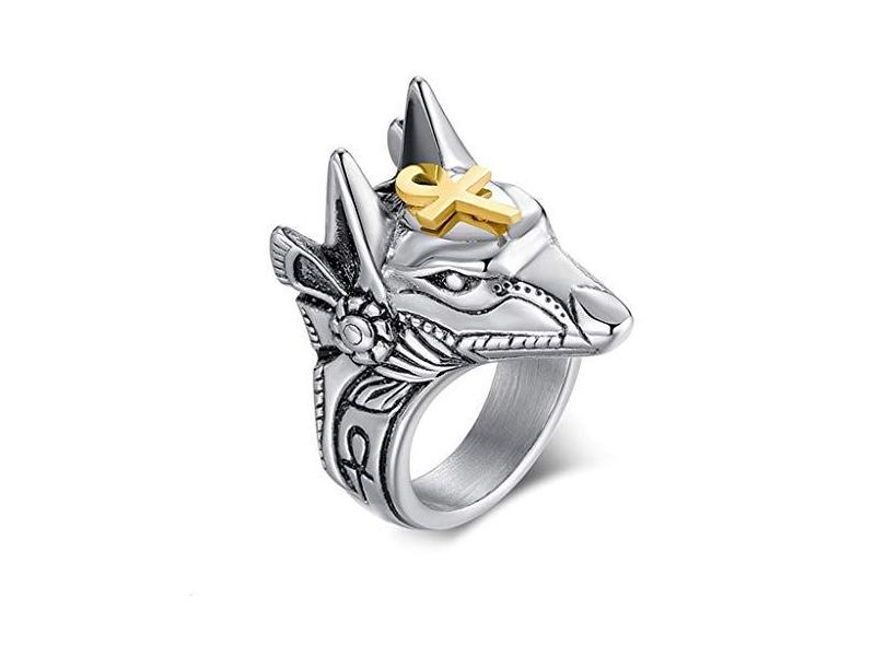 Rubsy Anel masculino de aço inoxidável, deus egípcio, anúbis, vintage, banhado a ouro, anel de cruz Ankh