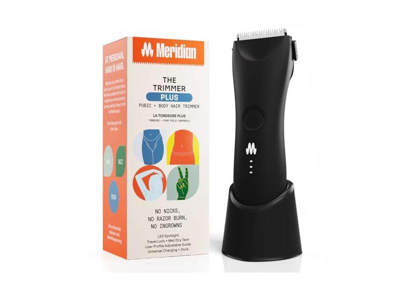 MERIDIAN Trimmer Plus Aparador de pelos corporais, protetor ajustável, carregamento USB C, luz de flash, trava de viagem, estação de carregamento, aparador de biquíni, aparador de pelos corporais