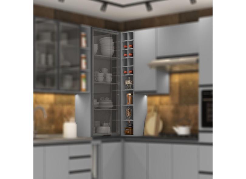 Armário Aéreo Canto 1 Porta Vidro 6 Prateleiras Adega Cozinha Modulada Belize 100% MDF Cinza Claro