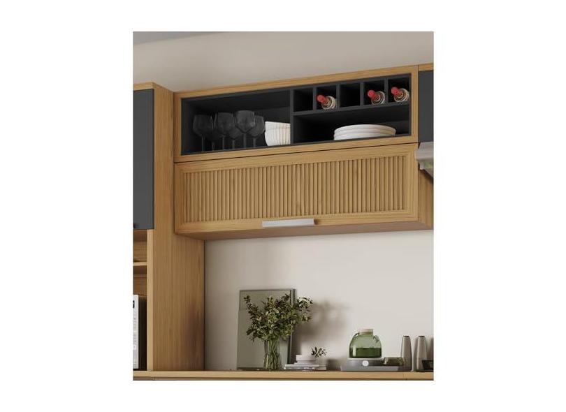 Armário Aéreo de Cozinha 120cm 1 Porta Horizonal Canelada e Nicho Garrafeiro New Porto Mdf Freijó/Grafite