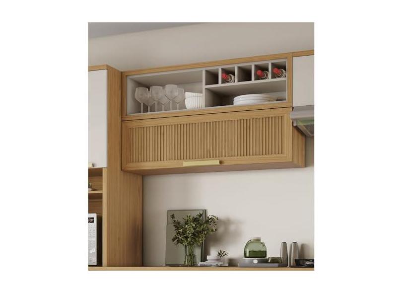 Armário Aéreo de Cozinha 120cm 1 Porta Horizonal Canelada e Nicho Garrafeiro New Porto Mdf Freijó/Off White