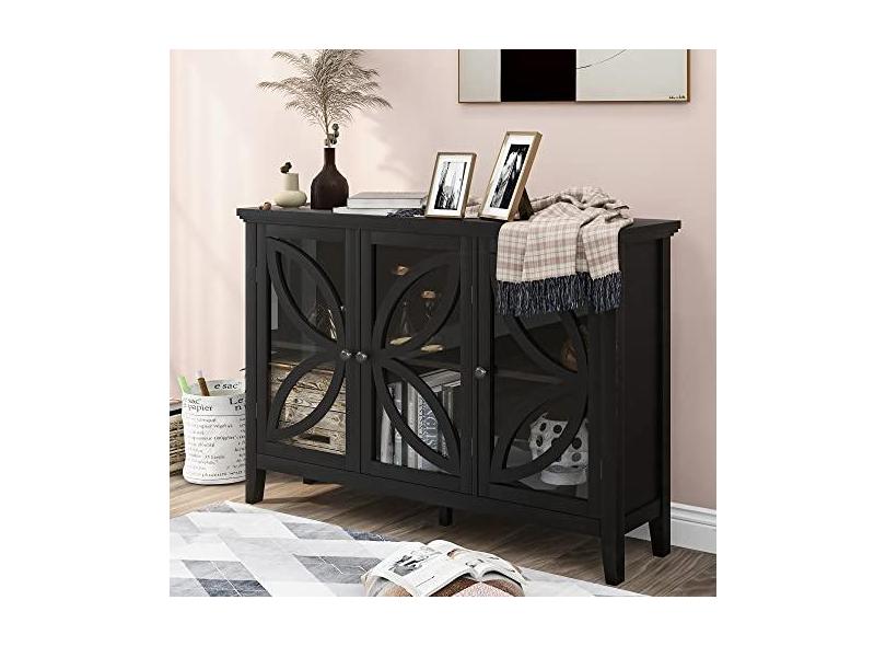 Armário de armazenamento moderno, buffet com detalhes de madeira, armário de armazenamento de fazenda com 3 portas de vidro e prateleira ajustável para cozinha, escritório, quarto, corredor, entrada,