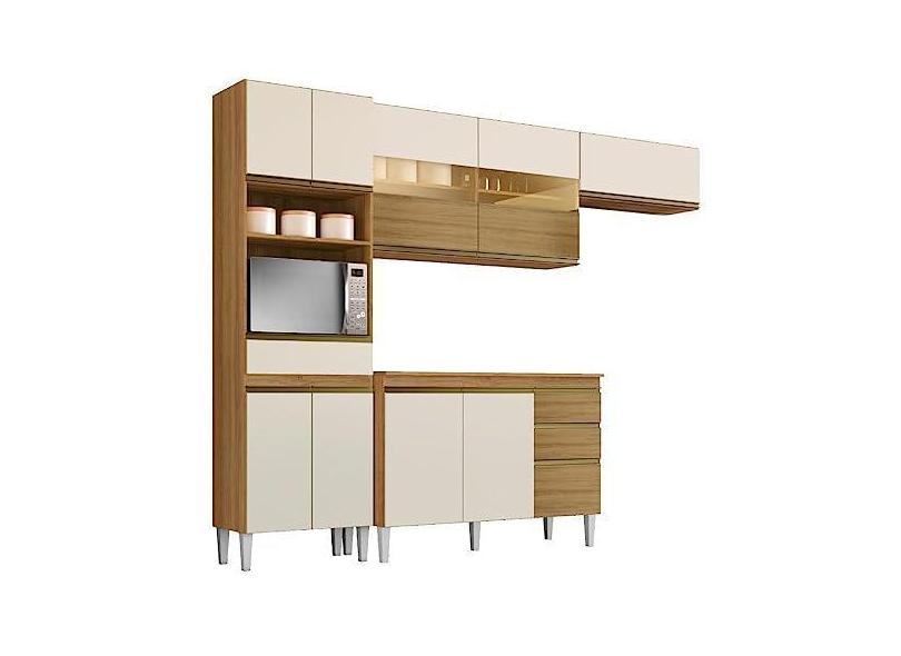 Armário de Cozinha Completa com Balcão e Nicho para Micro-ondas 9 Portas 3 Gavetas Clara Atacama/off White Aramóveis