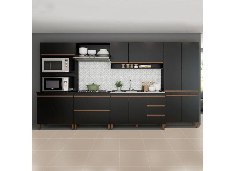 Armário de Cozinha Modulada Gourmet com Balcão Pia Sabrina 360x202Cm 6 Peças MDP Preto MENU