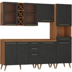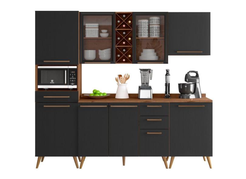 Armário de Cozinha Zanzini Favorita 5 peças com vidro e 8 portas 3 gavetas com 238 cm de Largura Natura Preto tx