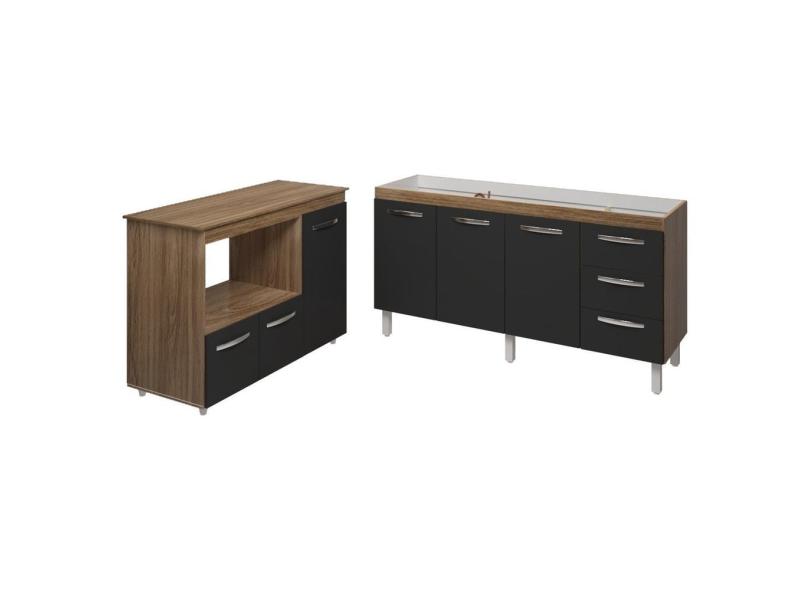 Balcão Cozinha Armário Gabinete de Pia 160 cm Estela e Balcão Para Microondas e Forno Elétrico Lilian Savana Preto