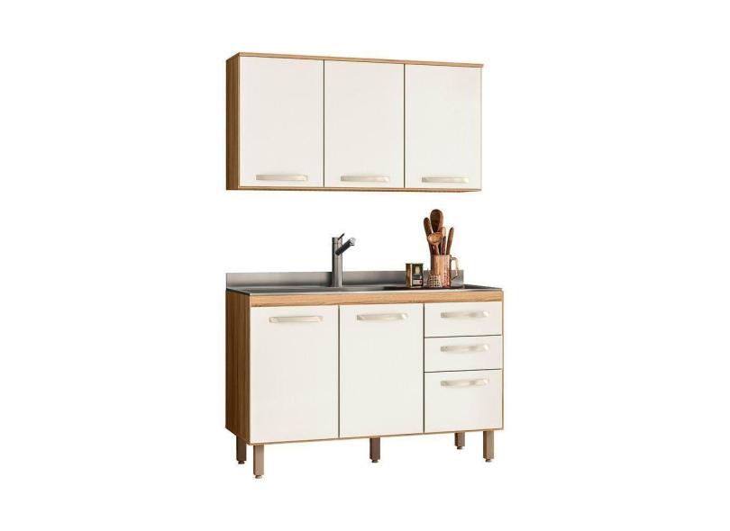 Balcão De Pia 120 Cm C- Armário Aéreo Cozinha 5 Portas 2 Gavetas Fit Cor Freijó - Off White Cristal