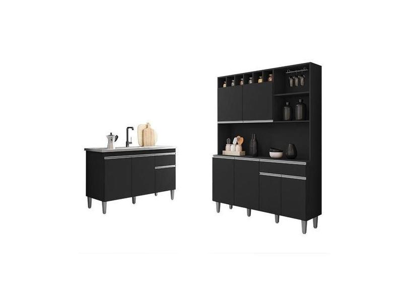 Balcão de Pia Tatiane 120 cm e Armário Cozinha Kit Alice Preto Fosco -