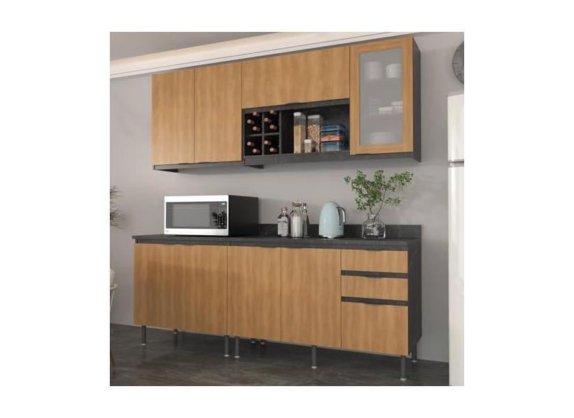 Cozinha Compacta Azaleia 200cm com Tampo, 4 Peças, 8 Portas e 3 Gavetas com Divisor de Talheres Mármore/Freijó