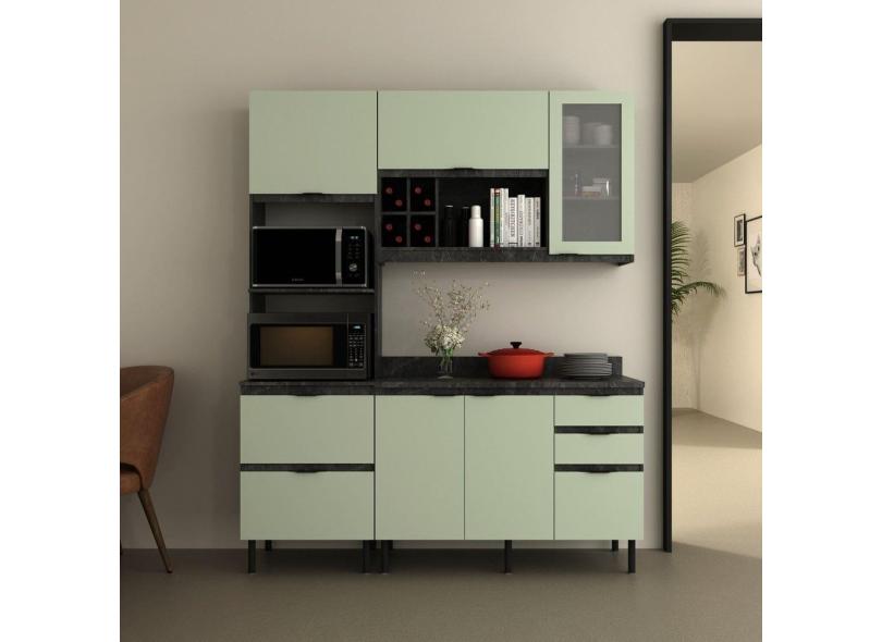 Cozinha Compacta Begônia 180 Cm 3 Peças, 6 Portas e 4 Gavetas com Divisor de Talheres e Tampo Cz1203 Mármore Lunar/Verde Mar
