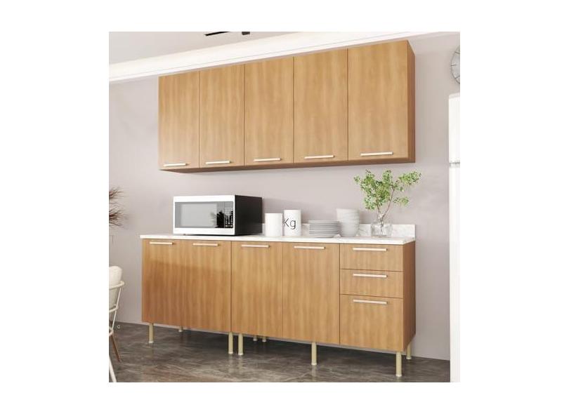 Cozinha Compacta Girassol 200cm com Tampo, 4 Peças, 9 Portas e 3 Gavetas com Divisor de Talheres Freijó/Branco