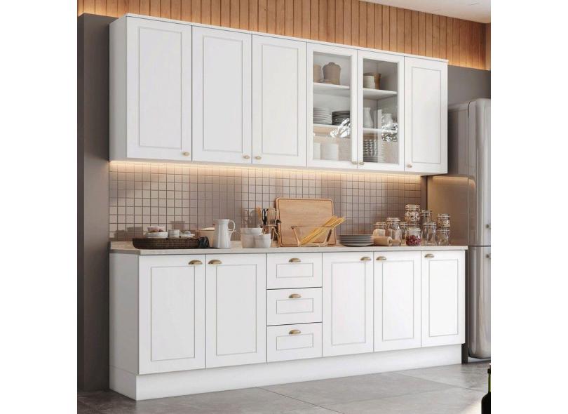 O menor preço encontrado no Brasil para Cozinha Completa Americana 11 Portas 3 Gavetas com Vidro 100% Mdf Branco - Henn atualmente é R$ 2.924,18.