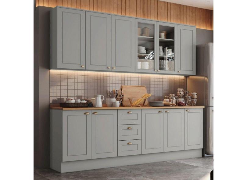 O menor preço encontrado no Brasil para Cozinha Completa Americana 11 Portas 3 Gavetas com Vidro 100% Mdf Cinza - Henn atualmente é R$ 2.729,23.