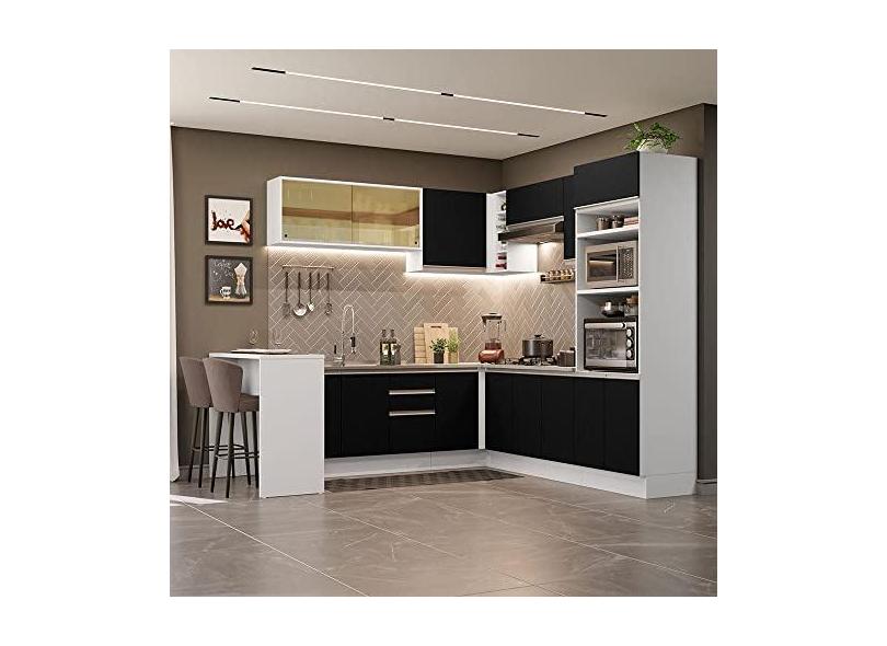 O menor preço encontrado no Brasil para Cozinha Completa de Canto Madesa Glamy 504001 com Armário e Bancada (s/Tampo e Pia) - Branco/preto atualmente é R$ 3.654,99.