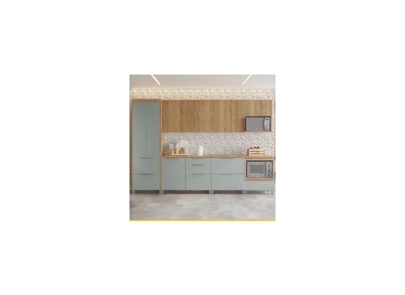 Cozinha Completa em MDF Nesher Paris Ripada com 340 cm de Largura, 9 Portas, 7 Gavetas e 13 Prateleiras - Verde/Nature