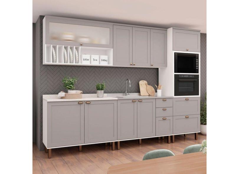 O menor preço encontrado no Brasil para Cozinha Completa Iluminata Luna 10 Portas 4 Gavetas 100% Mdf com Vidro Branco/Marrom Claro - Genialflex atualmente é R$ 2.744,63.