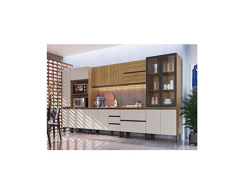 Cozinha Modulada 10 Peças Tampo Aéreo 3 Portas Balcão, Paneleiro Plátano Quiditá Montana/fumê