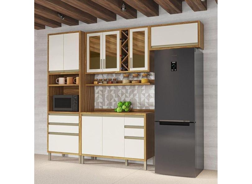 Cozinha Modulada Compacta 4 Peças 9 Portas com Vidro e Tampo 100% Mdf Barbados Espresso Móveis Amêndoa/Off White