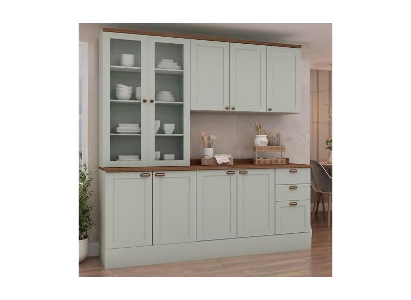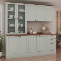 O menor preço encontrado no Brasil para Cozinha Modulada Compacta 4 Peças com Armário Aéreo 2 Portas Vidro 100% Mdf com Tampo Mint/Ébano atualmente é R$ 1.999,99.