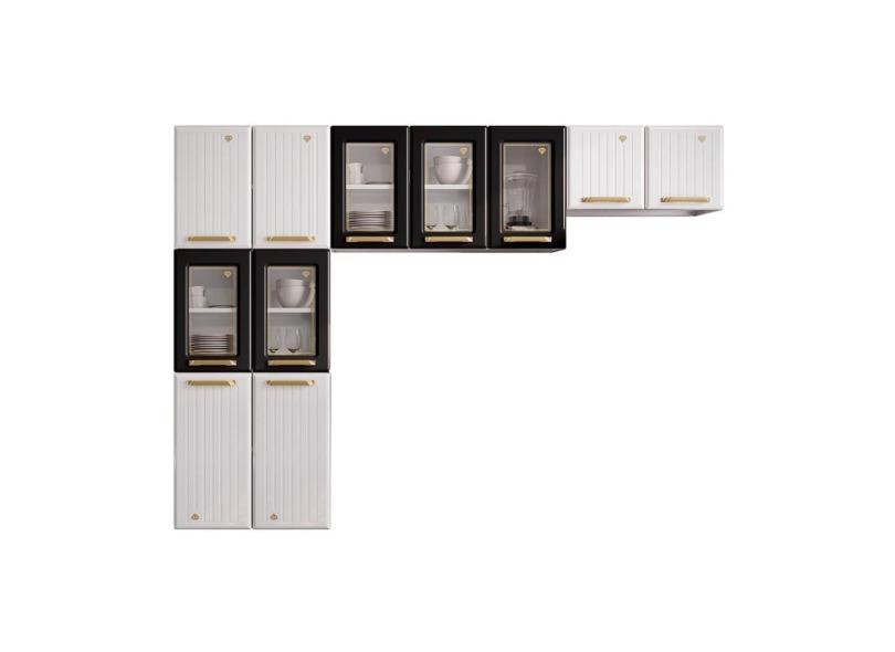 Cozinha Modulada Completa 3pçs 2 Armários 1 Paneleiro C/ 5 Portas De Vidro Branco/Preto Telasul