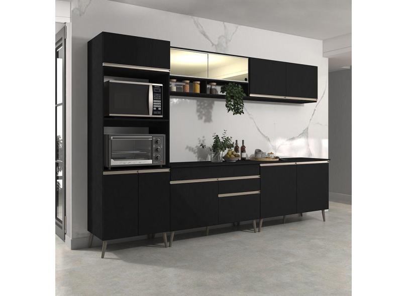 Cozinha Modulada Completa 5 Peças Com Paneleiro Armário Balcão Vidro E Tampo Veneza Preto Acetinado