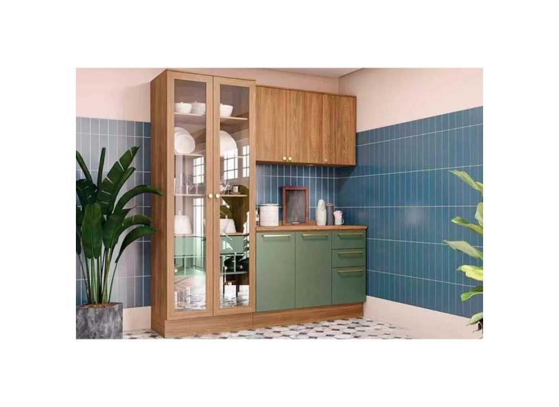 Cozinha Modulada Completa Botanic 4 Peças (1Aéreo+1Balcão+1Cristaleira+1Complemento) M656 Nogueira/Verde Oliva - Kappesberg