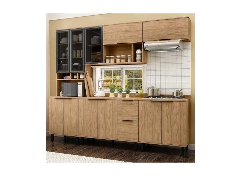 O menor preço encontrado no Brasil para Cozinha Modulada Toscana 5 Peças Mdf com Aéreo 1200 Porta de Vidro e Paneleiro com Tampo Freijó atualmente é R$ 1.955,54.
