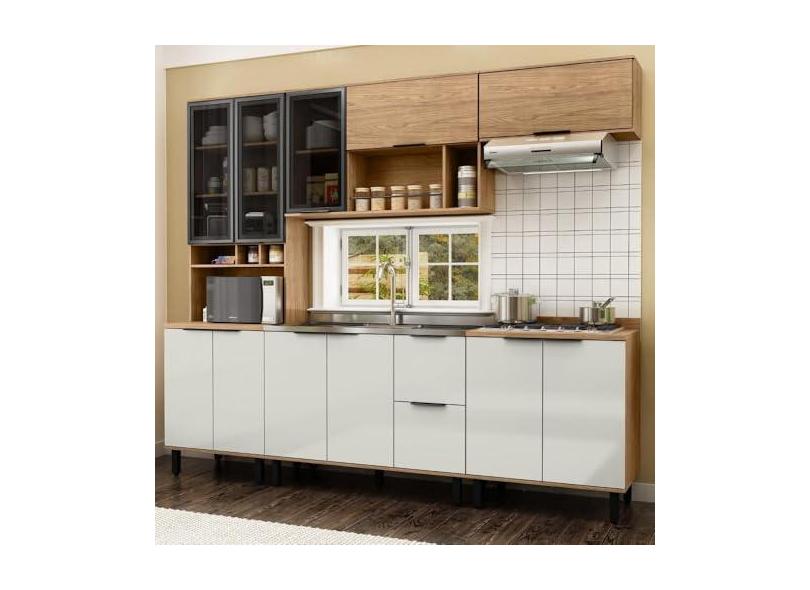 Cozinha Modulada Toscana 5 Peças Mdf com Aéreo 1200 Porta de Vidro e Paneleiro Freijó/off White