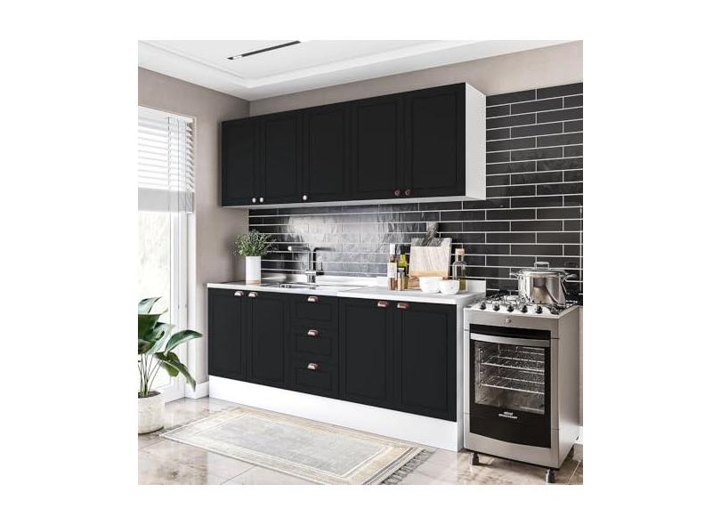 Cozinha Pérola com Rodapé 4 Peças Aéreos com 5 Portas, Balcão 2 Gavetas 3 Portas e Balcão 2 Portas Y Branco/Preto