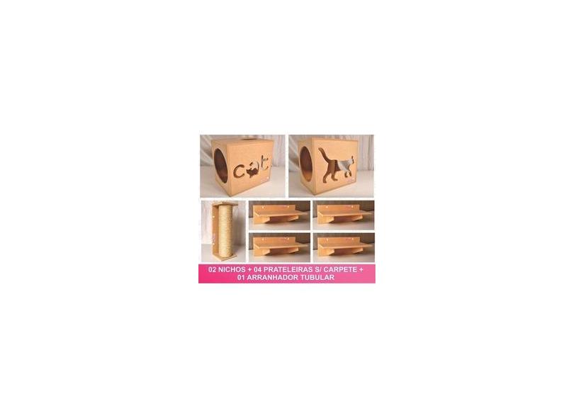 Kit Nicho Gatos 07 pcs - 02 Nichos + 04 Prateleiras+ 01 Arranhador - Mdf Cru