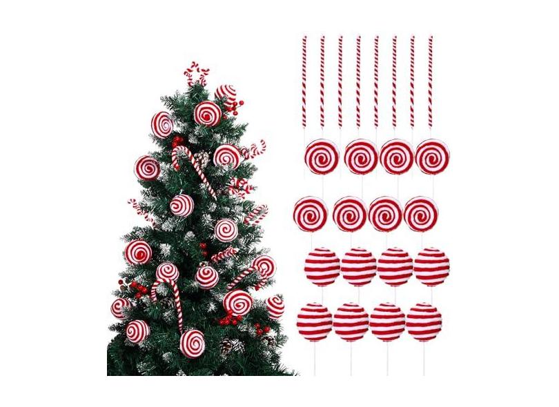 Yerliker 24 peças de enfeites de Natal vermelhos e brancos, bolas de Natal fofas, galhos encaracolados, palitos de árvore de Natal para casa, guirlanda de Natal, guirlanda, vaso de mesa, decoração de