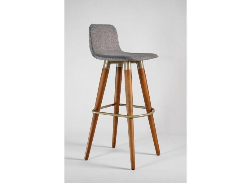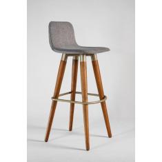 3 Banquetas Alta Rustica Pes de Madeira Fixação em Aço Champanhe Tecido Linho Cinza