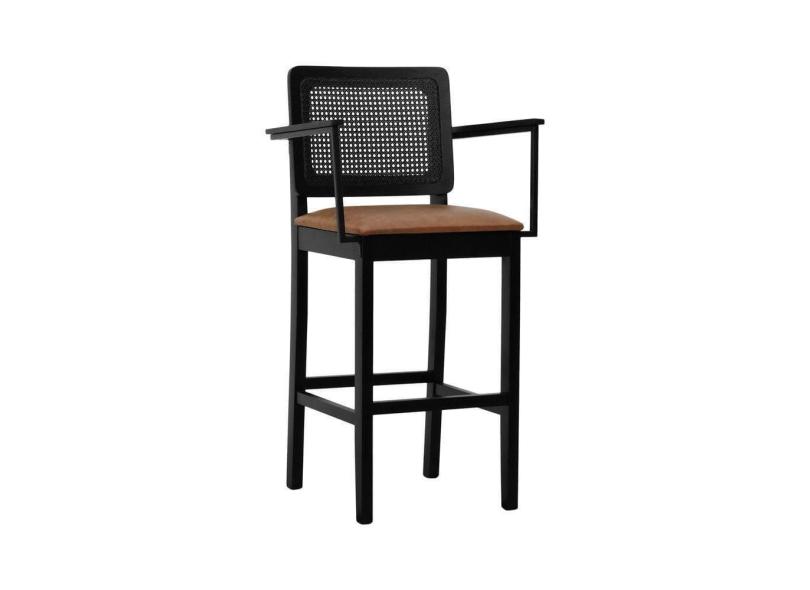 Banqueta Alta Bistrô Lyon Telinha Madeira Maciça C-braço - Preto Assento Estofado Corano Marrom Mescla