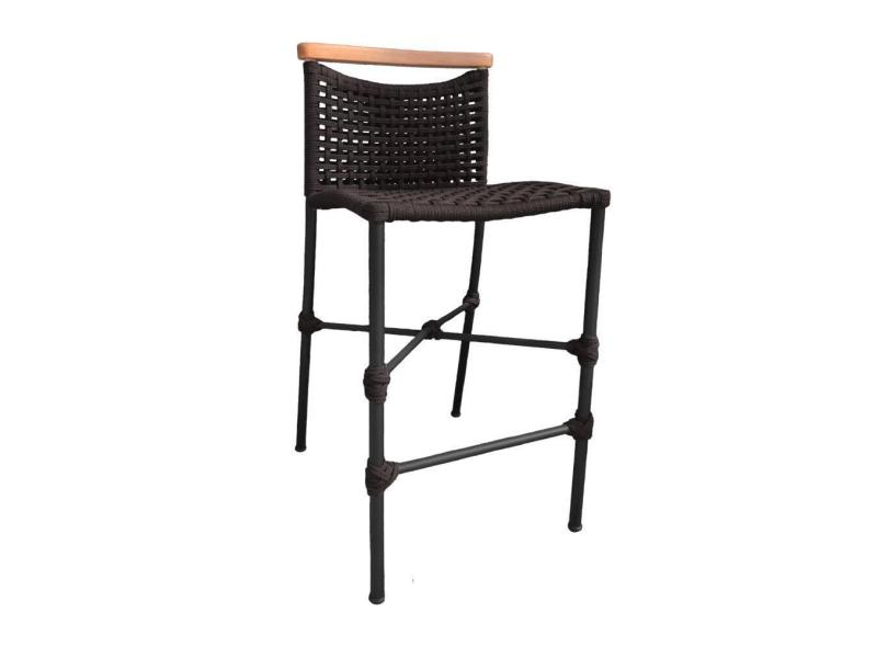 Banqueta Anne em Corda Náutica Base em Alumínio Preta com Detalhe em Madeira Marrom
