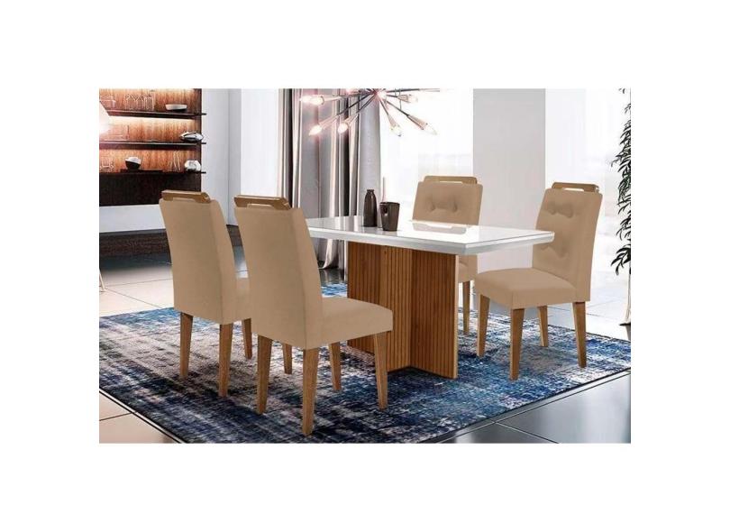 Banqueta de Cozinha Berlim c/ Tampo Madeirado c/ Vidro Canto Curvo 120x80cm e 4 Cadeiras Imperatriz Imbuia/Off White - Suede Capuccino - Rufato