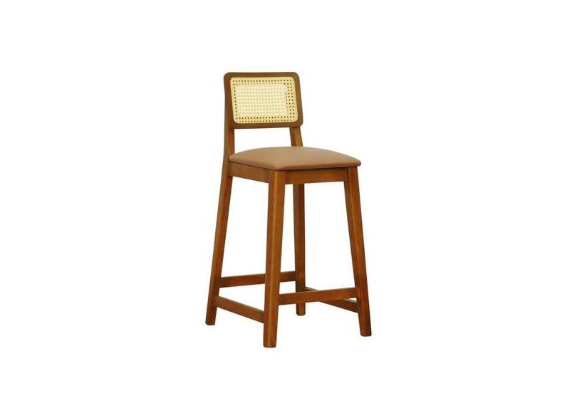 Banqueta Gabi 68cm Altura Madeira Maciça Encosto Telinha Assento Estofado Corano Amêndoa/Caramelo