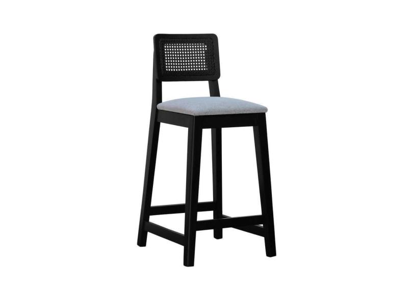 Banqueta Gabi Madeira Maciça Encosto C- Telinha C- 68cm Altura - Preto Assento Estofado Linho Cinza Mescla Impermeável