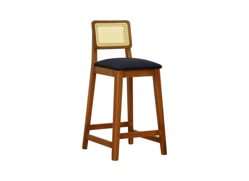 Banqueta Gabi Madeira Maciça Encosto Telinha c- 68cm Altura - Amêndoa Assento Estofado Linho Preto Textura