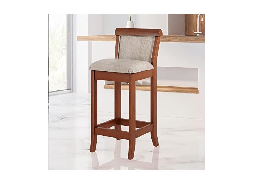 Banqueta Média Estofada Encosto Mônaco 36x90Cm Bancada Madeira Maciça Imbuia Linho Bege M58 - RMI