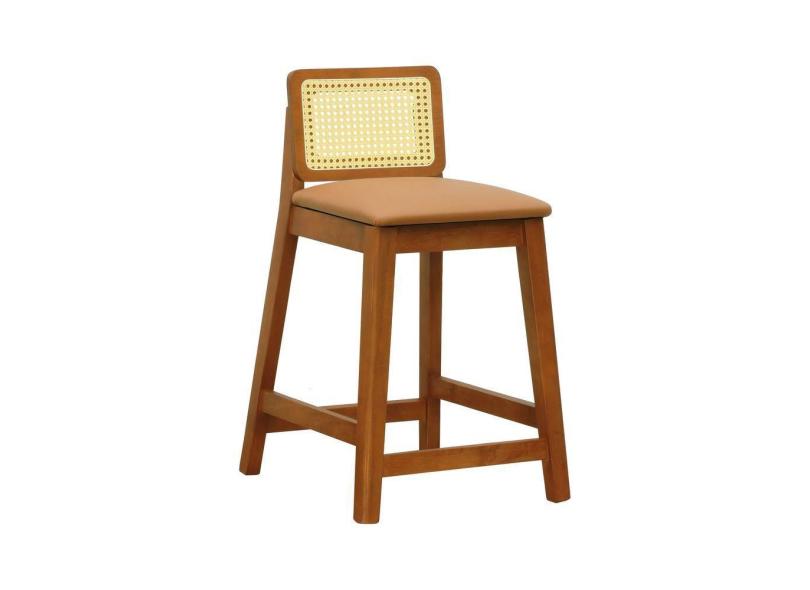Banqueta Média Gabi Madeira Maciça Telinha Natural - Amêndoa Assento Estofado Corano Caramelo