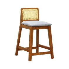 Banqueta Média Gabi Madeira Maciça Telinha Natural - Amêndoa Assento Estofado Linho Bege Mescla Impermeável