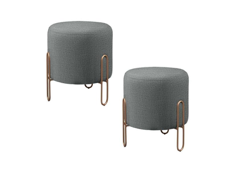 Conjunto - 2 Puffs Banqueta Mali Luxo Base Metálica Bronze Linho Cinza