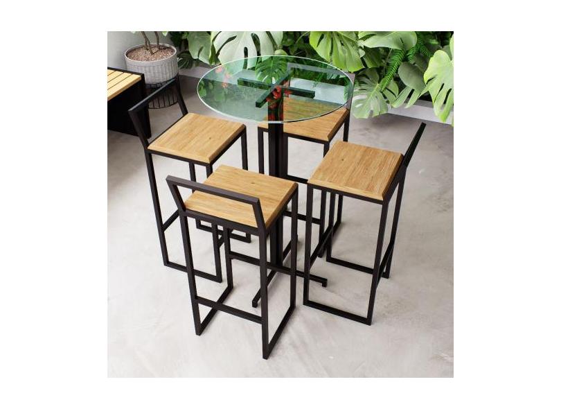 Conjunto Mesa Alta Bar Bistrô Redonda Vidro 4 Banquetas Confort Pinus