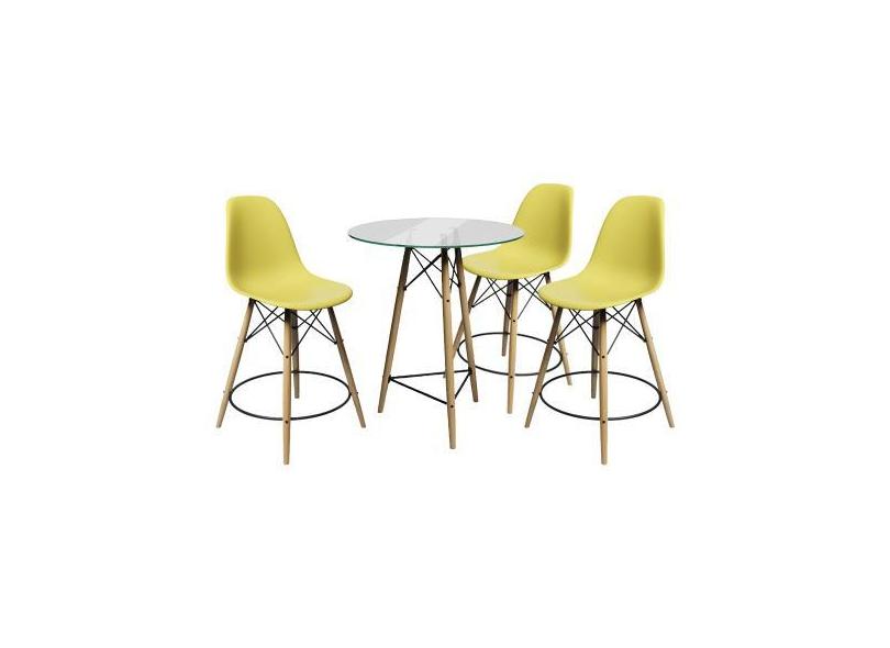 Conjunto Mesa Bistrô Eames Eiffel Vidro com 3 Banquetas Amarelas de Ma