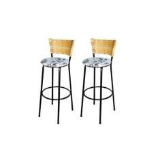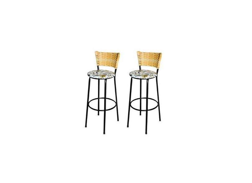 Jogo 2 Banqueta Alta Para Cozinha Ratan Palha Preta Estofado Floral -