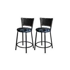 Jogo 2 Banqueta Baixa Para Cozinha Ratan Preta Estofado Floral - Lamar